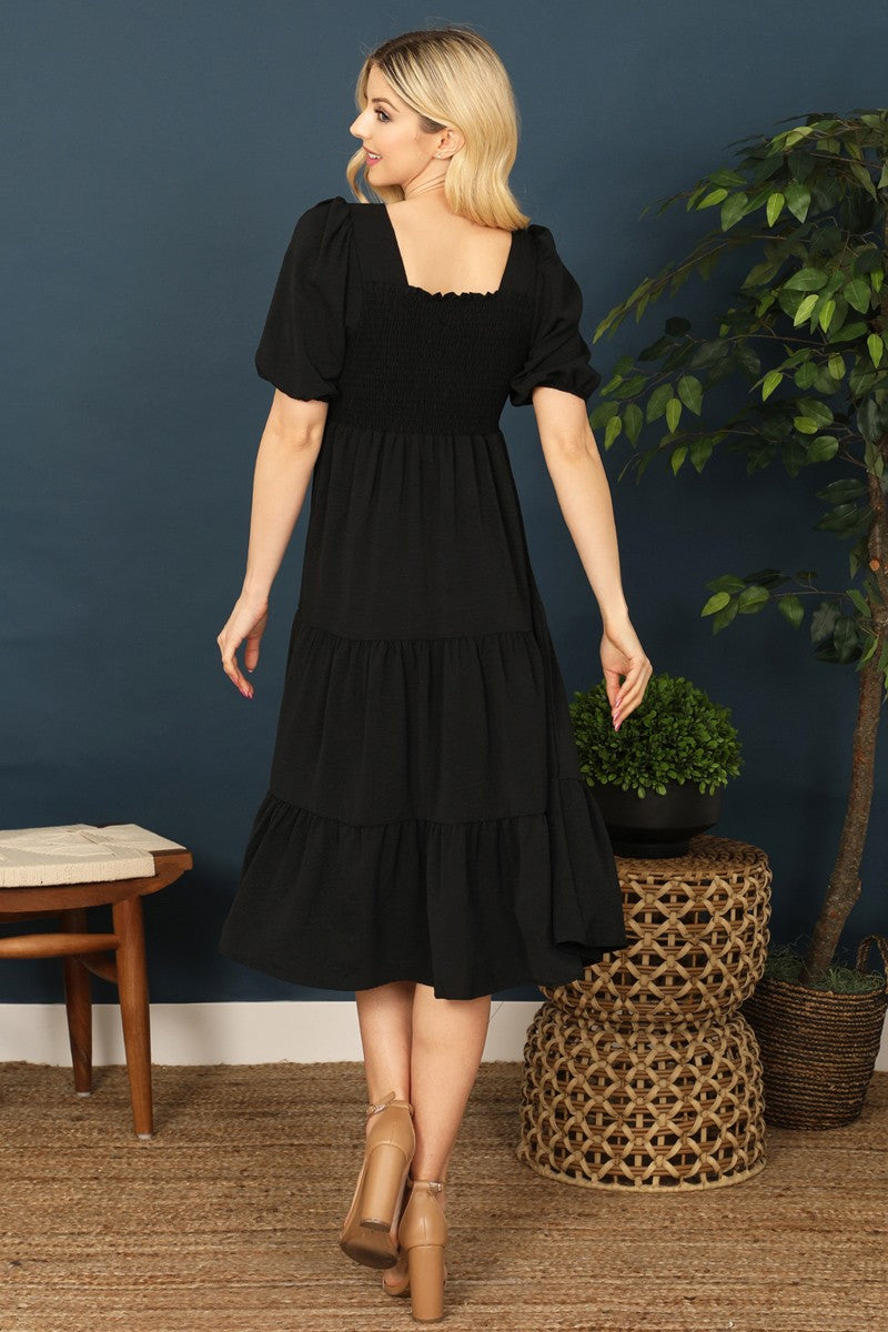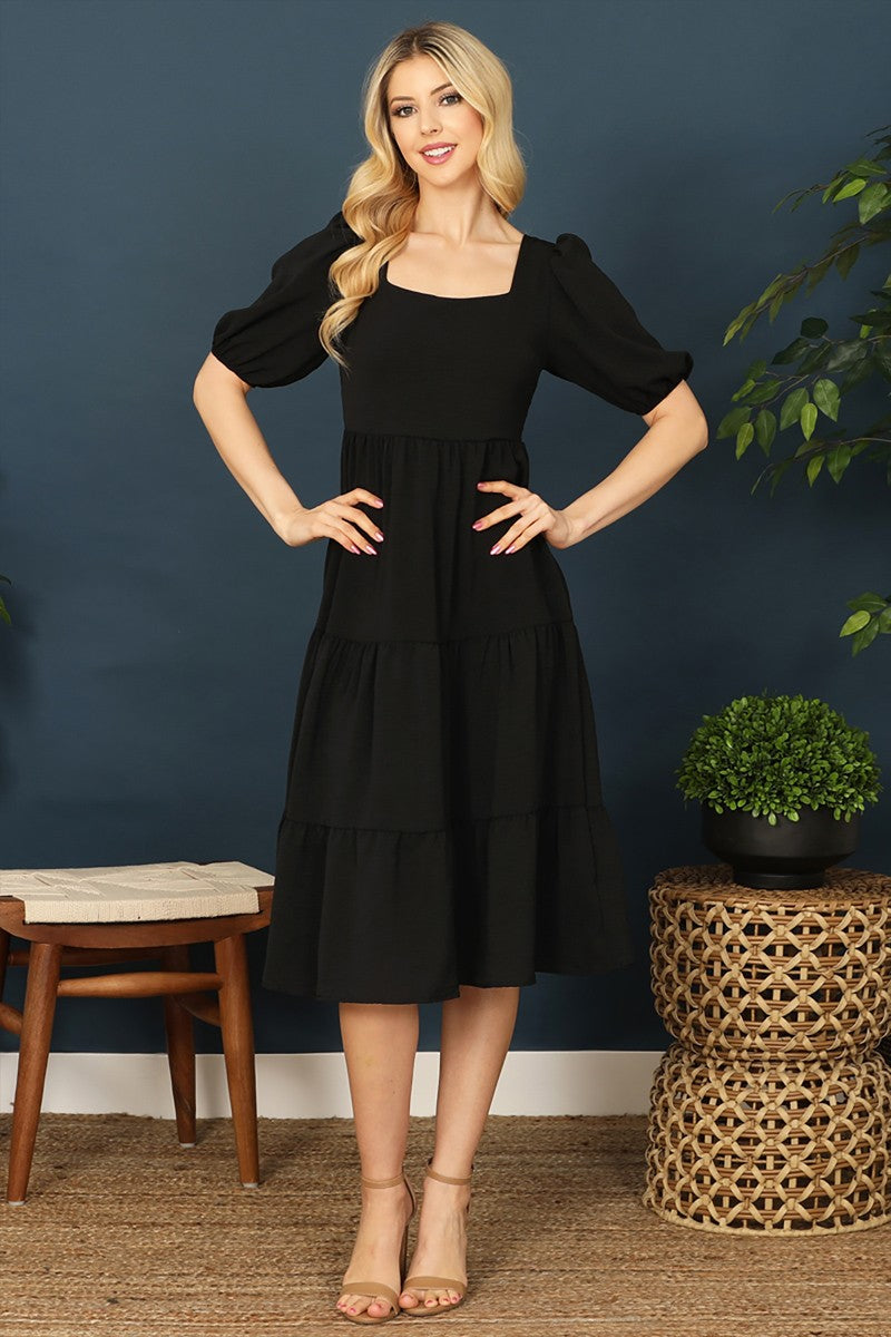 Everyone needs a little black dress! This dress is simple but has a few cute details. It has a square neck and a puff sleeve. It is a solid tiered midi dress. This dress is perfect for an occasion!