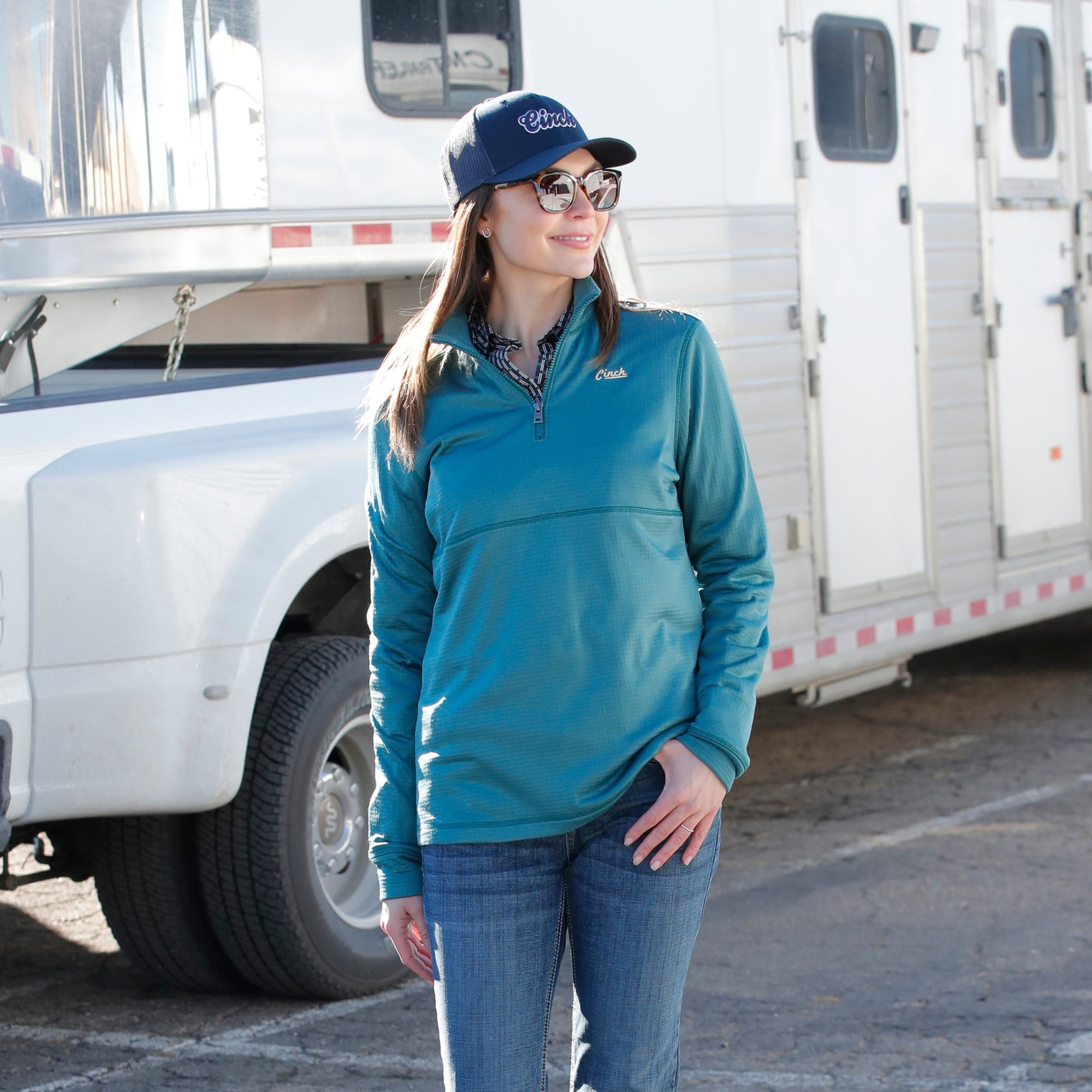 This jacket from Cinch is such a fun color and it is such a nice material! Perfect for working out, doing chores, or even throwing it on to go to town! It features a green color with a slight bluish tint to it and a 1/4 zip closure with a nice hemline under your bust.