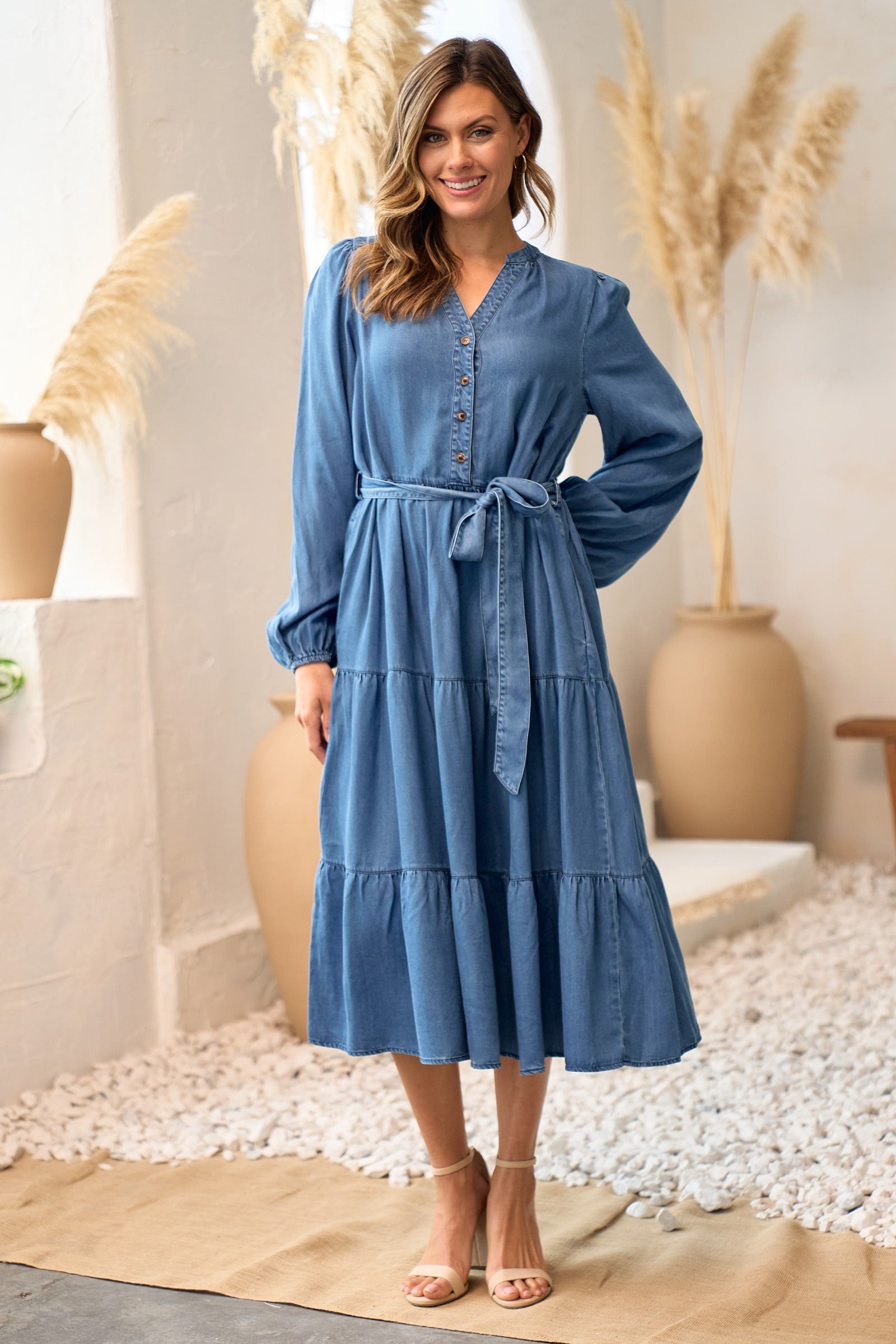 This is the perfect denim dress! It has a button front tiered midi dress with self belt.