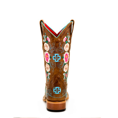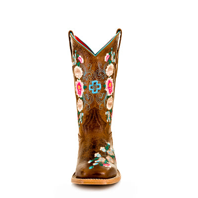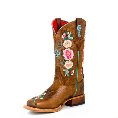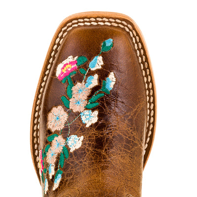 Come grab the cutest floral cowgirl boots for your little girl! Leather boot with leather roper heels. They feature a brown color called honey bunch.