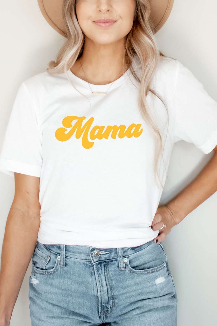 Every mom needs this adorable Mama Shirt! This is a white Bella canvas shirt with Mama printed in mustard. Simple and Classic!