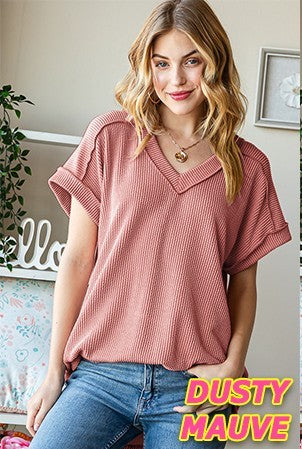 This is the perfect oversized t-shirt! Wear it with leggings for a relaxed day or dress it up with some nice jeans! It has a short sleeve with a V neck. It is ribbed and has stitch detail.