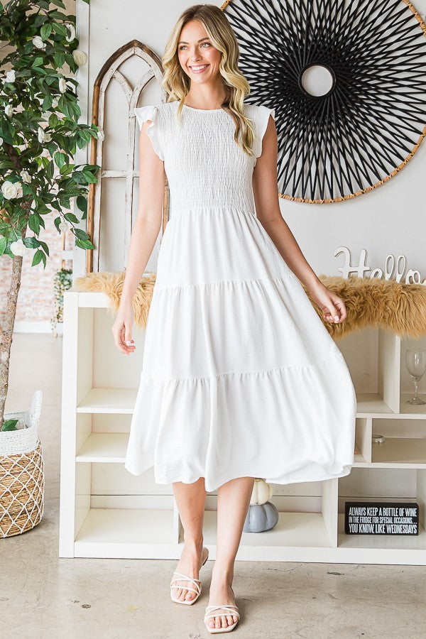 This is a must have spring dress! It is a smocked tiered midi dress with a short cap sleeve.